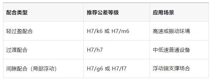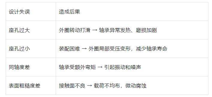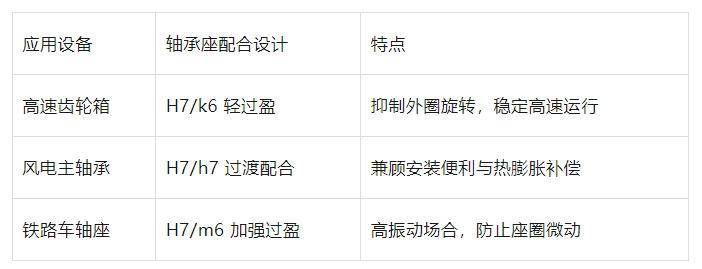 特别注意:动承载(旋转外圈)场合需优先选用过盈配合,避免外圈打滑。静承载(旋转内圈)场合座孔允许轻微间隙配合,方便热膨胀补偿。常见公差设计失误及后果